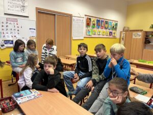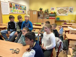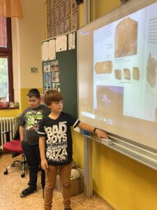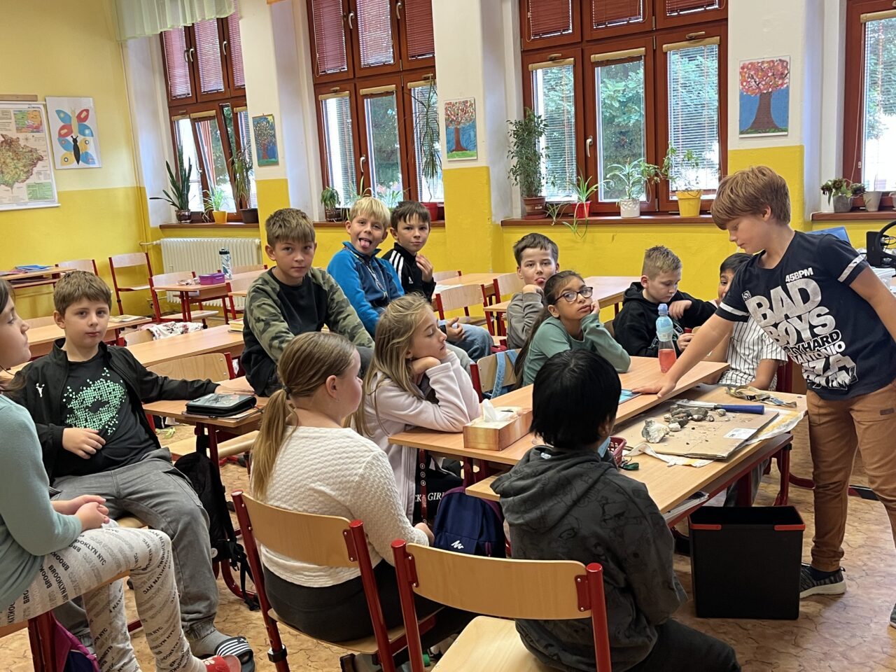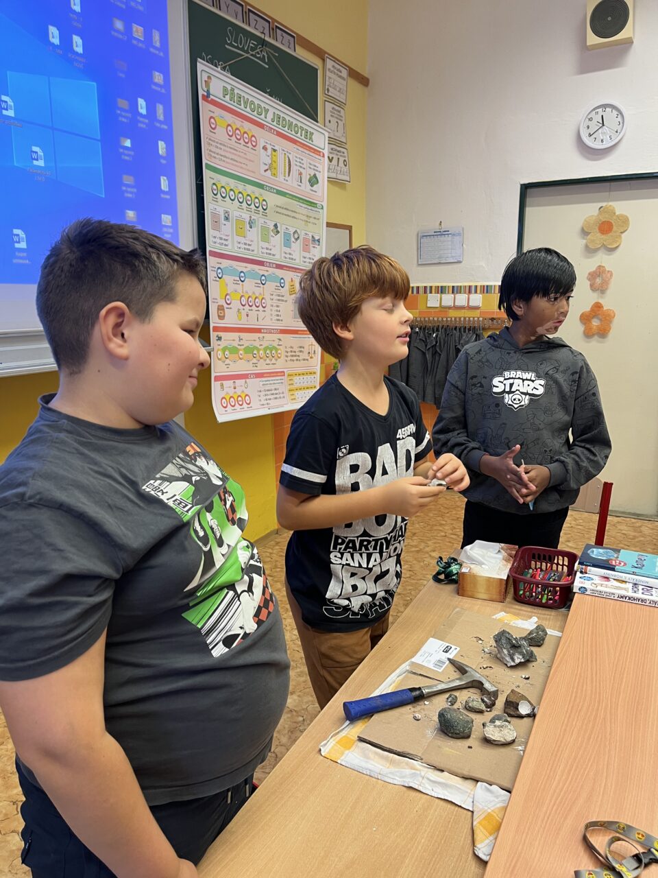 Naši dva spolužáci – Jakub Lis a Fanda Holeček –  si pro děti připravili zajímavou hodinu. Kubík přinesl ukázky různých nerostů… děti si je mohly prohlédnout a některé i kladívkem rozbít. A každý si kousek odnesl… Objasnili vznik obsidiánů. Děkujeme kluci, bylo to perfektní!