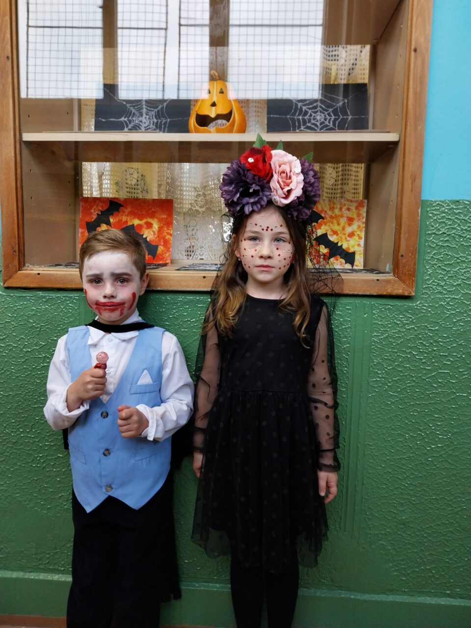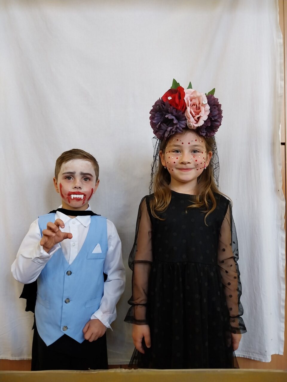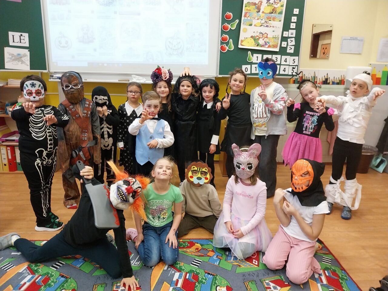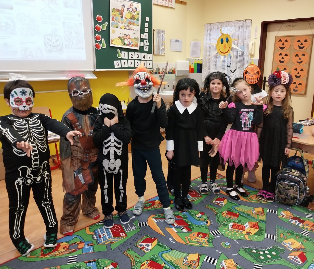 Ve čtvrtek 23.10. před podzimními prázdninami jsme ve škole potkávali spoustu podivných bytostí. I v naší třídě se to hemžilo kostlivci, upíry ….