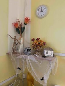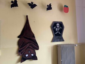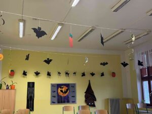 I v letošním roce byla Školním parlamentem vyhlášena halloweenská soutěž. Soutěžilo se o nejlepší masky a o nejstrašidelnější třídu. Co se týká masek, děti naší třídy se neúčastnily 🙁 Pouze děvčata, Eliška a Elen, si dala práci s kostýmem. V soutěži o nejstrašidelnější třídu jsme získali krásné druhé místo, opět díky Elišce, Elen, Míše a Samantě. Děvčata na výzdobě pracovala i ve svém volném čase – o polední pauze. Jim patří poděkování a sladká odměna 🙂