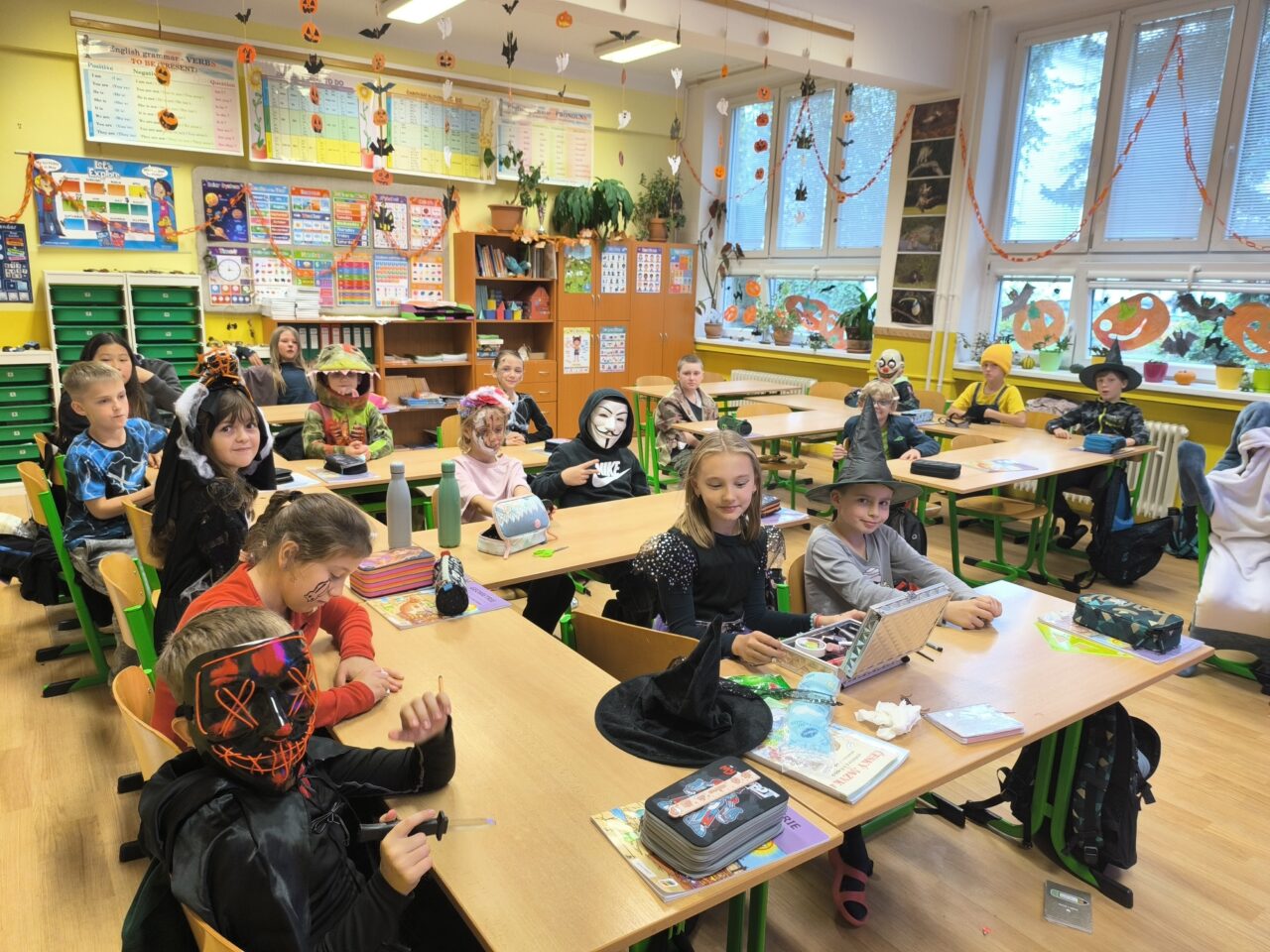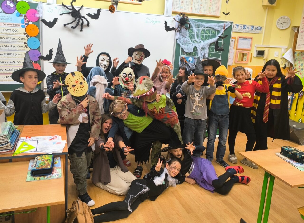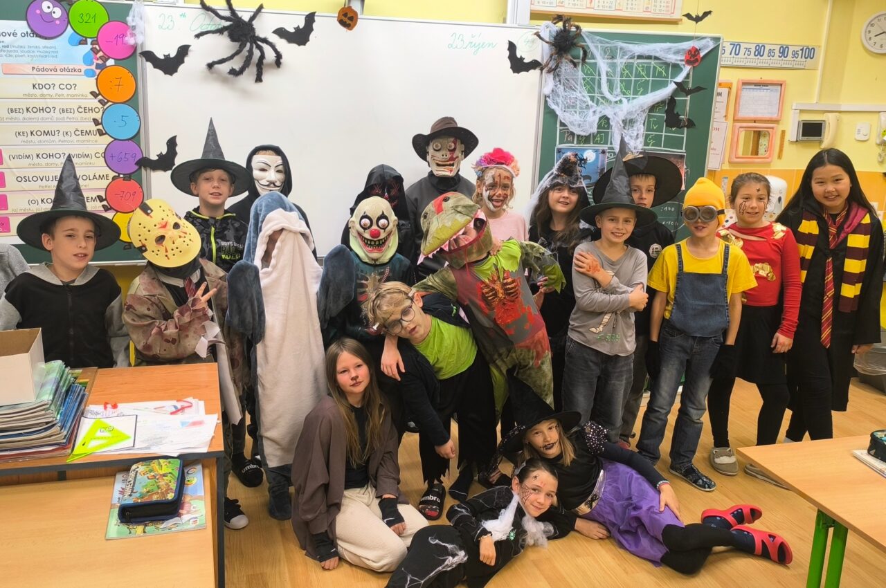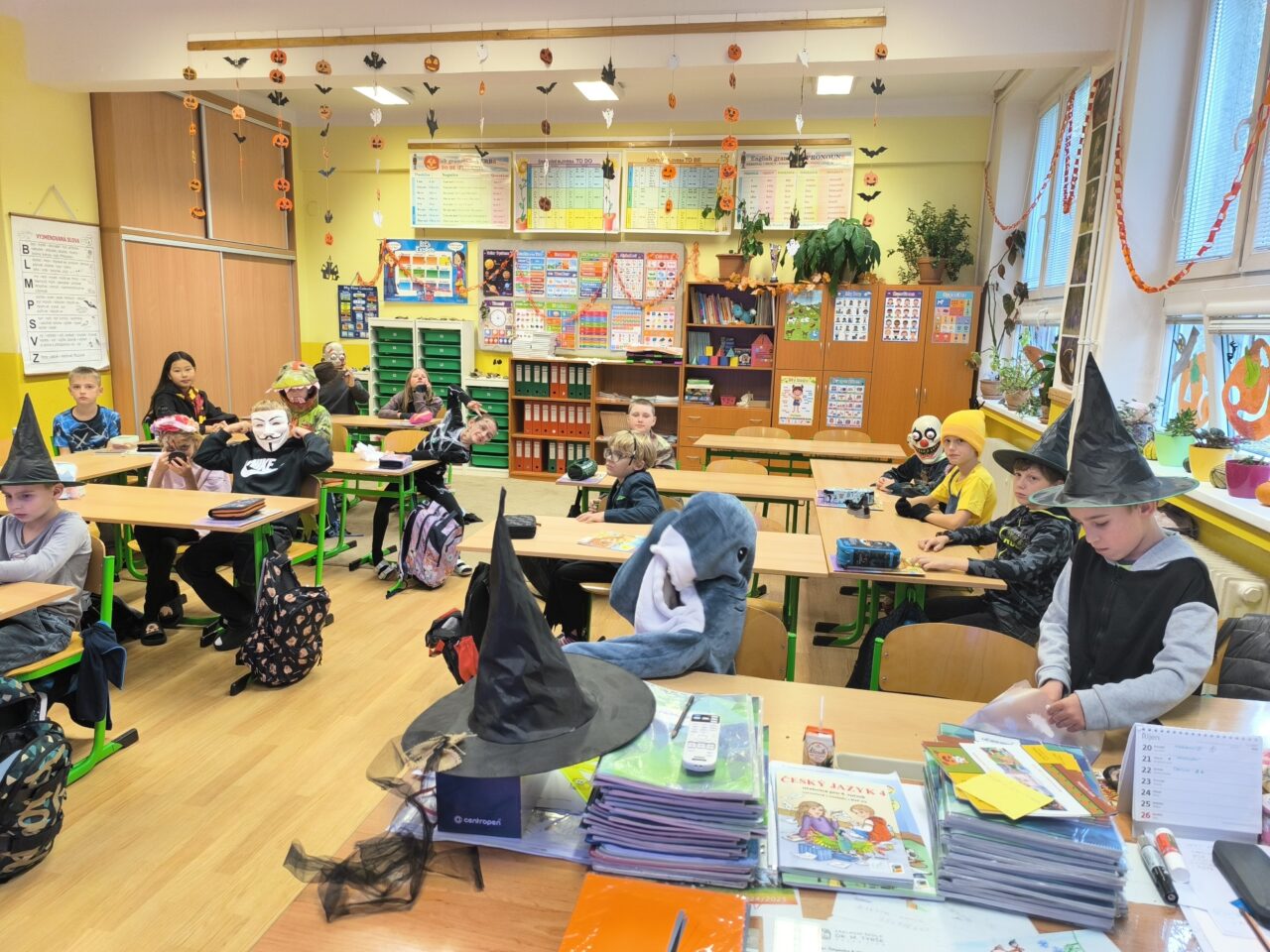 Dnes se naší školou místo spořádaných žáčků procházela nejrůznější monstra, příšerky, čarodějnice, zombie a jiné jak už pohádkové, tak fantazy postavy. Nebyla to náhoda, ale Školním parlamentem vyhlášený Halloweenský den. Sešli jsme se v naší Halloweensky vyzdobené třídě a mezi maskami si děti samy zvolily dvě podle nich nejhezčí. Doma vyrobenou masku měl podle nich nejhezčí Honzík Kocourek a kupovanou Maksym Sypko. Tito dva postupují do celoškolní soutěže o nejhezčí masku. Ve třídě jsme si zatančili na Halloveenské písničky což baví všechny děti. Společně jsme se zašli vyfotografovat do foto-koutku v hlavní budově. Jak to naším třídním maskám slušelo se můžete podívat na fotografiích.