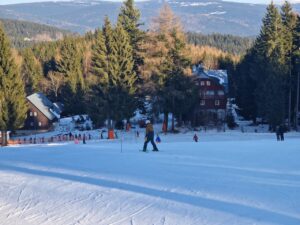Zasíláme poslední pozdrav z hor. Dnešní opět sluneční den jsme si opravdu užili. Celé dopoledne jsme trénovali na sjezdovce a jsme na sebe právem pyšní, protože dnes jsme všichni jezdili samostatně a kopec sjížděli bez doprovodu. Po gulášové polévce, rajské omáčce a následném odpočinku si pro nás paní učitelky a trenéři připravili závody ve slalomu. Úsek mezi brankami jsme projížděli kosmickou rychlostí. Za odměnu jsme pak zrelaxovali v teplých vířivkách. Po večeři ( dukátové buchtičky se šodó ) nás čekalo velké finále. Rozdělili jsme si odměny za úklid pokojů, výtvarné soutěži a samozřejmě ve sjezdu. Paní učitelka si pro nás opět připravila nádherné pamětní medaile a pamětní listy pro všechny, takže budeme mít na co vzpomínat a těšit se, že za rok se do Kořenova znovu vrátíme. A i když se nám domů skoro vůbec nechce, moc se na Vás těšíme. Takže přejeme dobrou noc a zítra ve 13:30 h na vlakovém nádraží.