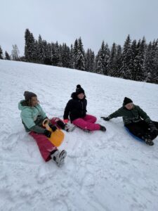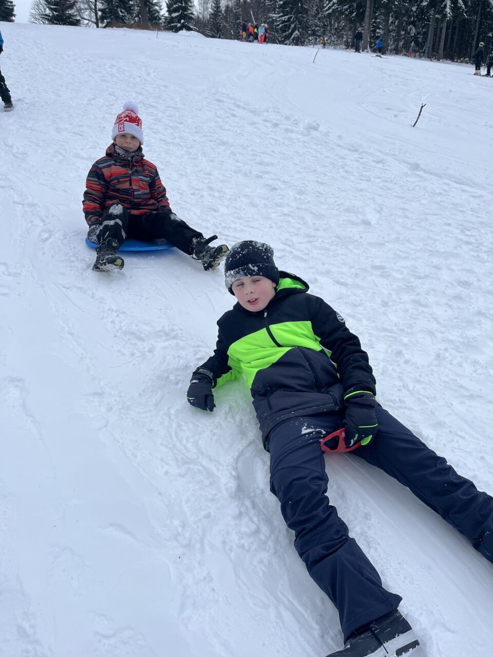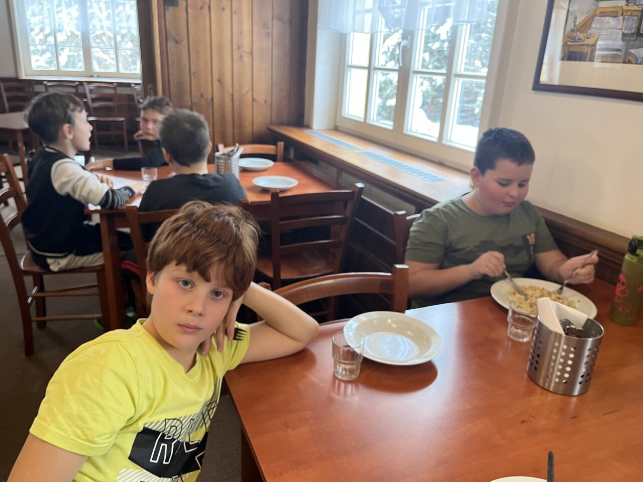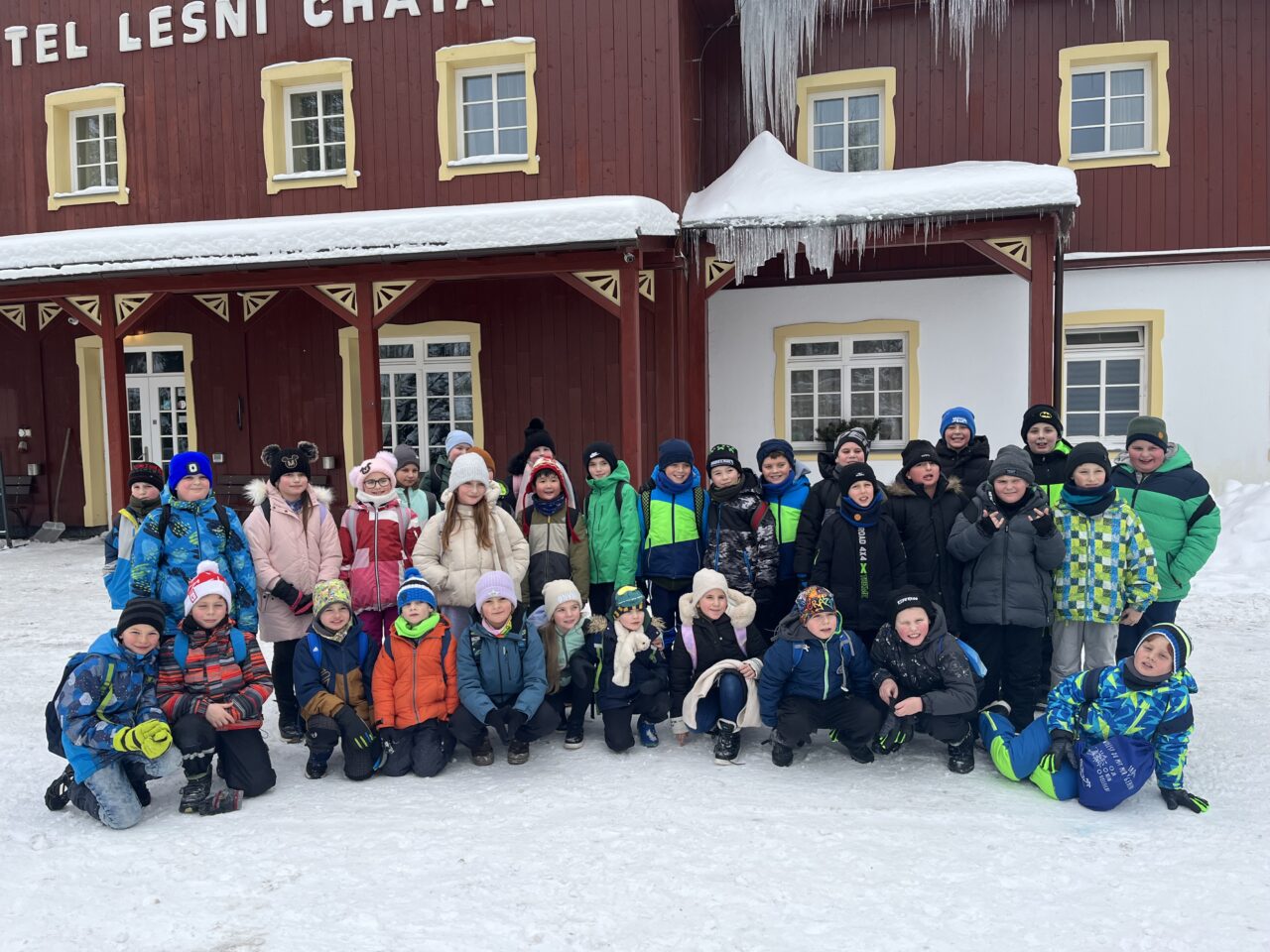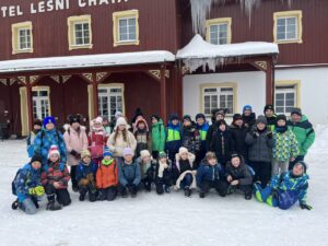 Zdárně jsme zvládli cestu vlakem. Cesta lesem byla jako z pohádky – krásně zasněžená. Ubytovali jsme se, pak byl pro nás připravený obídek, odpočinuli si. No a vyrazili jsme si užít sněhu…