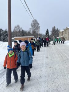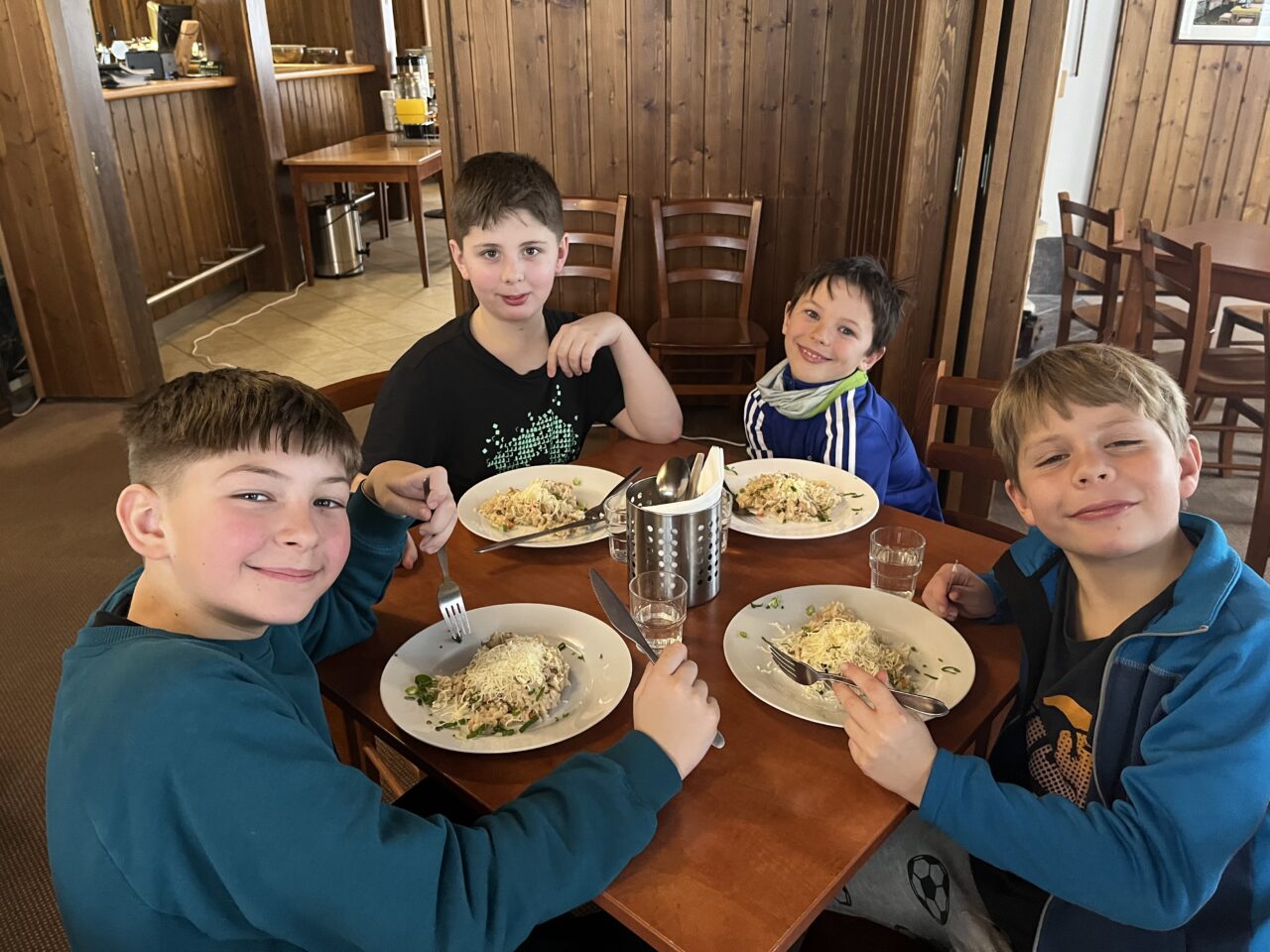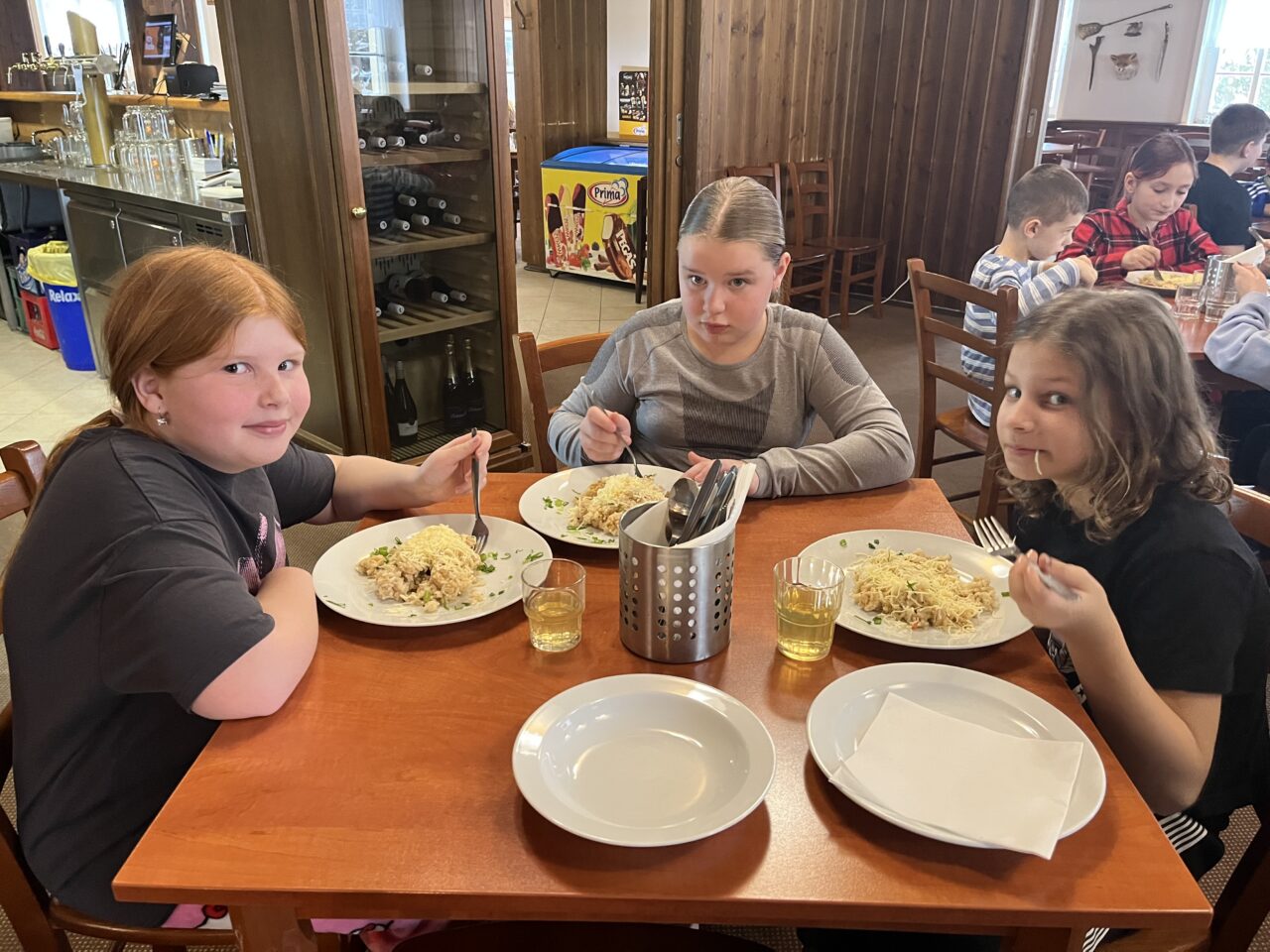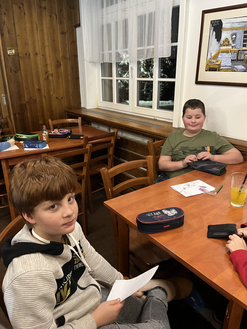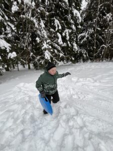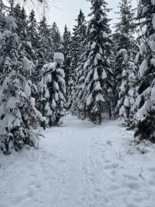 Zdárně jsme zvládli cestu vlakem. Cesta lesem byla jako z pohádky – krásně zasněžená. Ubytovali jsme se, pak byl pro nás připravený obídek, odpočinuli si. No a vyrazili jsme si užít sněhu…