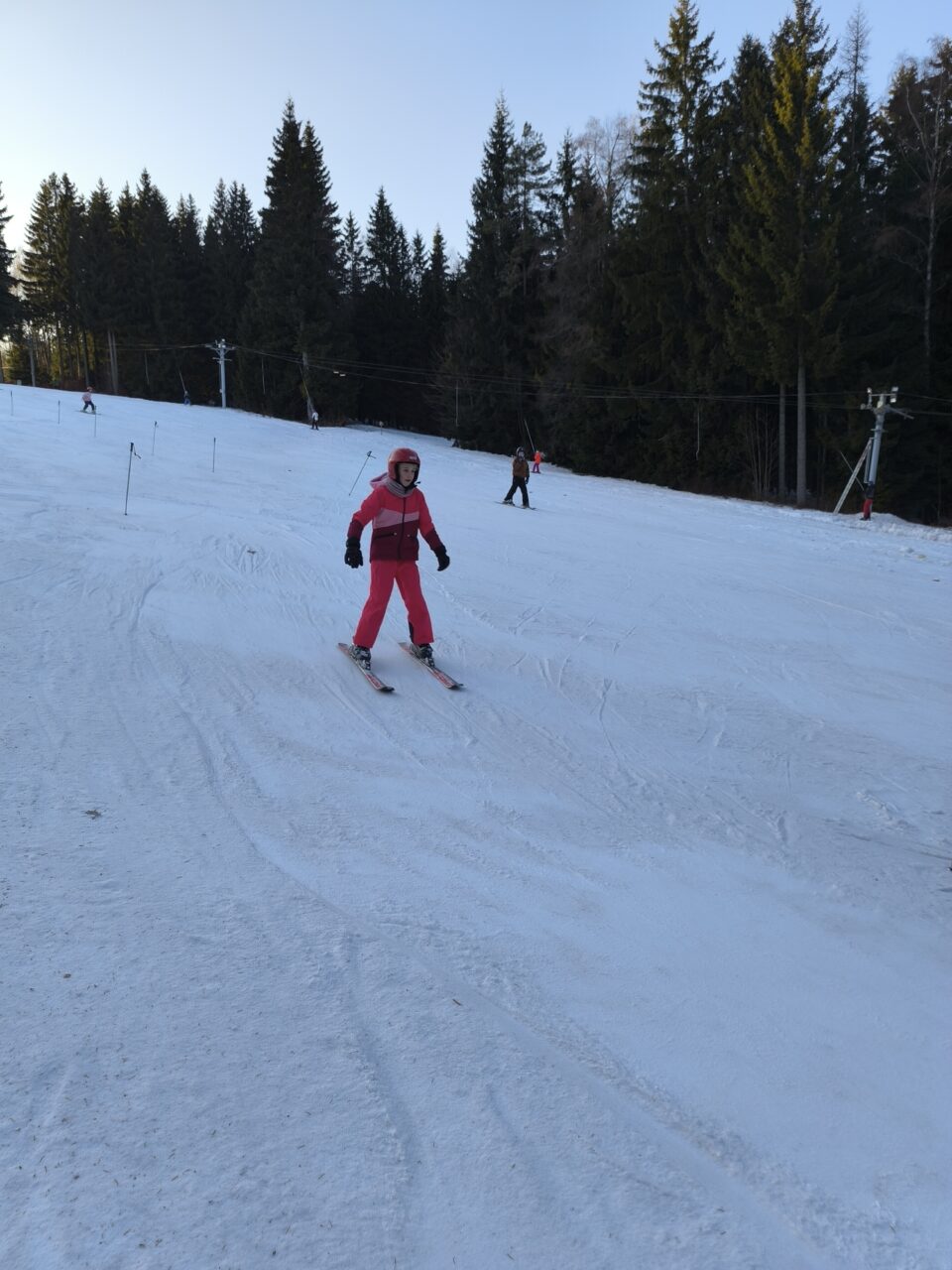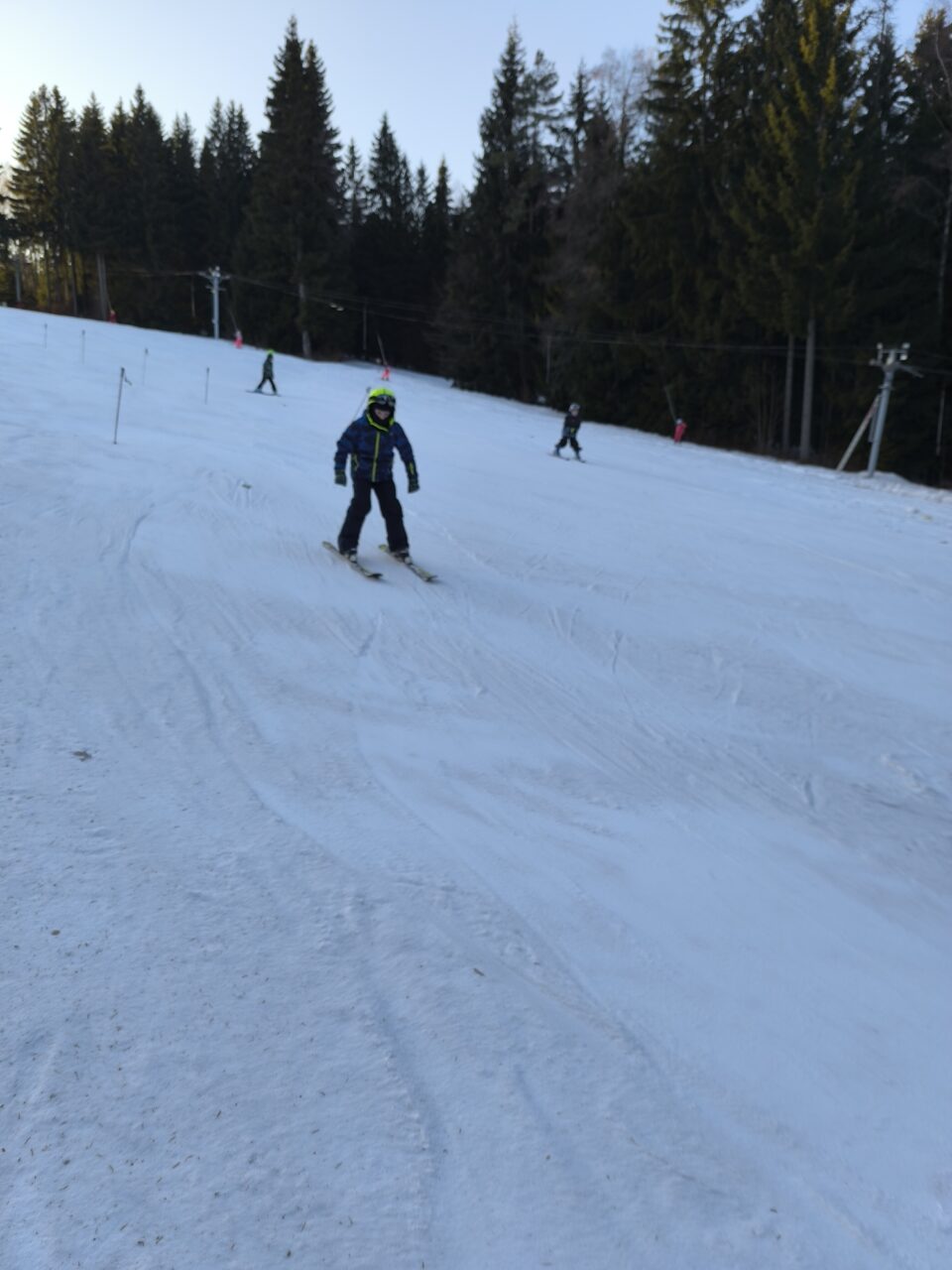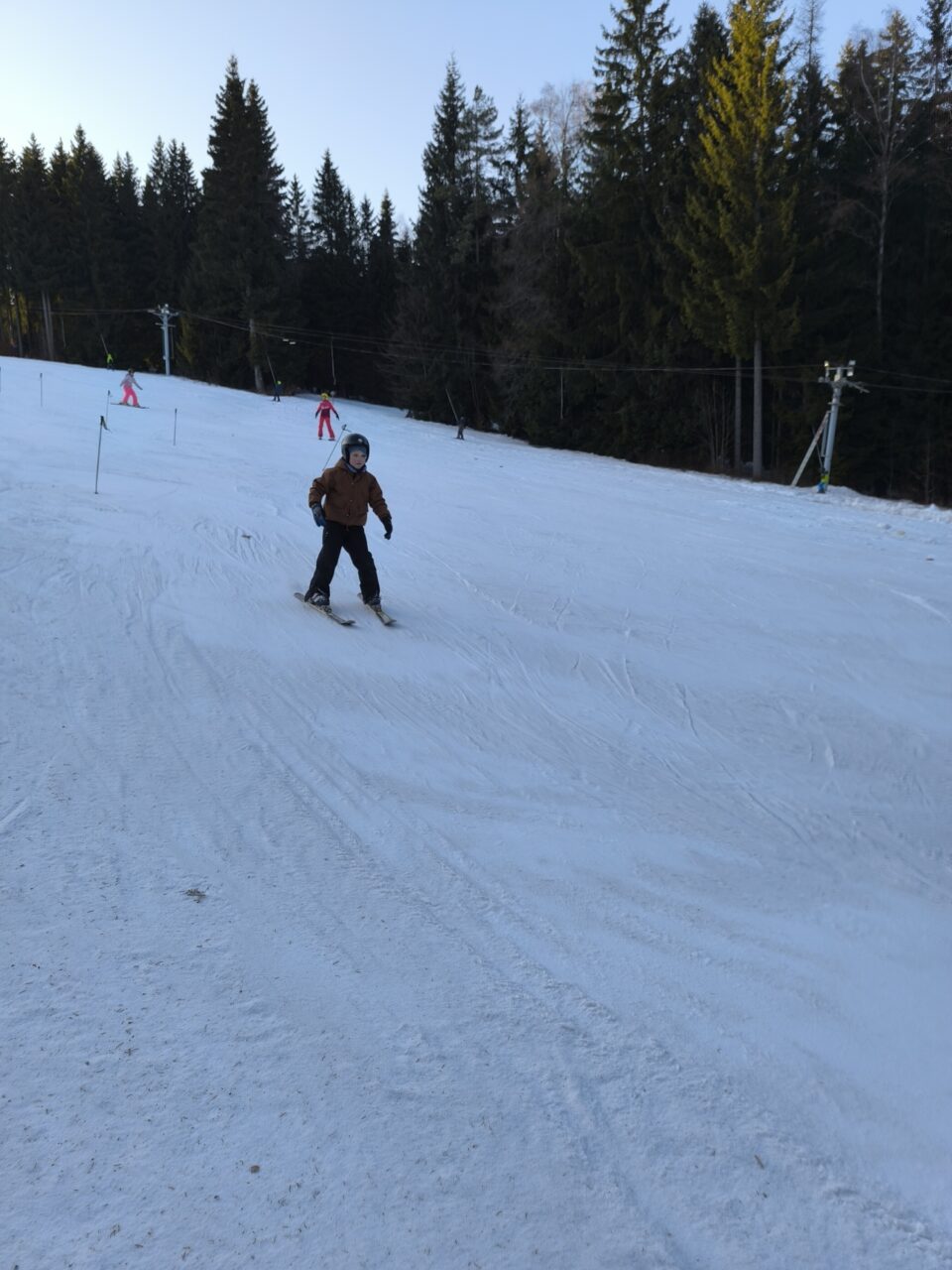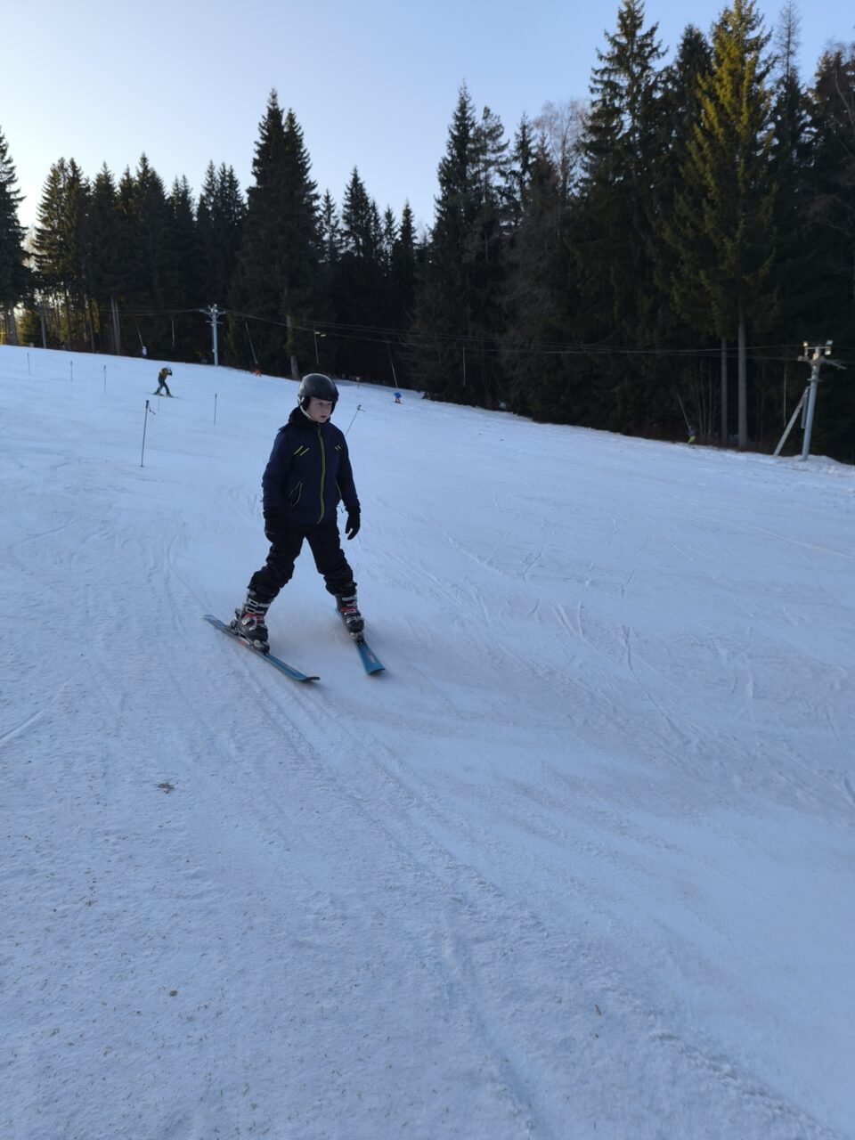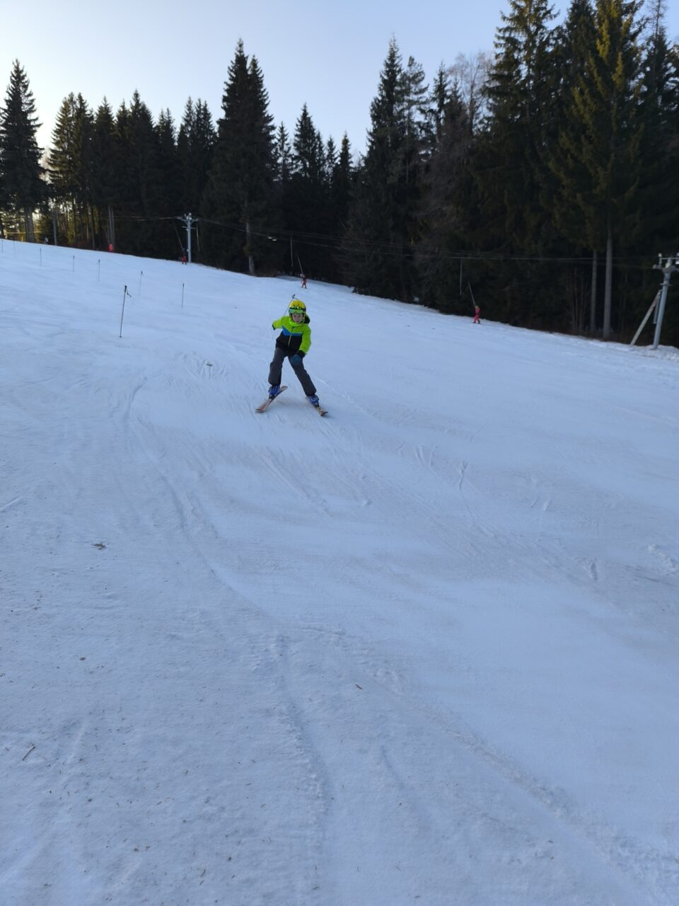 Dnešní sluneční, ale mrazivý den jsme si opravdu užili. Celé dopoledne jsme trénovali na sjezdovce. Mohli jsme na sebe být právem pyšní, protože jsme všichni jezdili samostatně, Naši lyžařští instruktoři dohlíželi na správný styl jízdy a učili nás pokročilejší techniku, jako je jízda na jedné lyži anebo pozadu. Po obědě a následném odpočinku si pro nás paní učitelky a trenéři připravili závody ve slalomu. Úsek mezi brankami jsme projížděli kosmickou rychlostí a mnozí začátečníci v lyžování překvapili svým časem. Vyhlášení vítězů jednotlivých ročníků proběhlo přímo na sjezdovce, za bouřlivého potlesku všech zúčastněných závodníků. Po večeři nás ještě čekala odměna v podobě zasloužené relaxace v teplých hotelových vířivkách. V závěru dne jsme si ještě všichni společně zhodnotili naše zážitky z tohoto týdne, převzali od paní učitelky a paní vychovatelky zasloužené sladké odměny, diplom a průkaz lyžaře a lyžařky. Před vyhlášenou večerkou ještě zůstalo trochu času na hudbu a tanec. Zítra hurá domů, už teď se nám po Kořenové stýská.