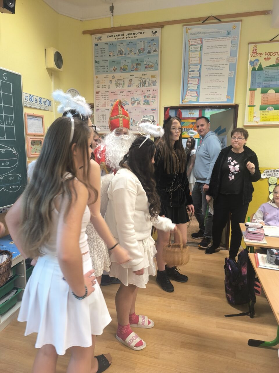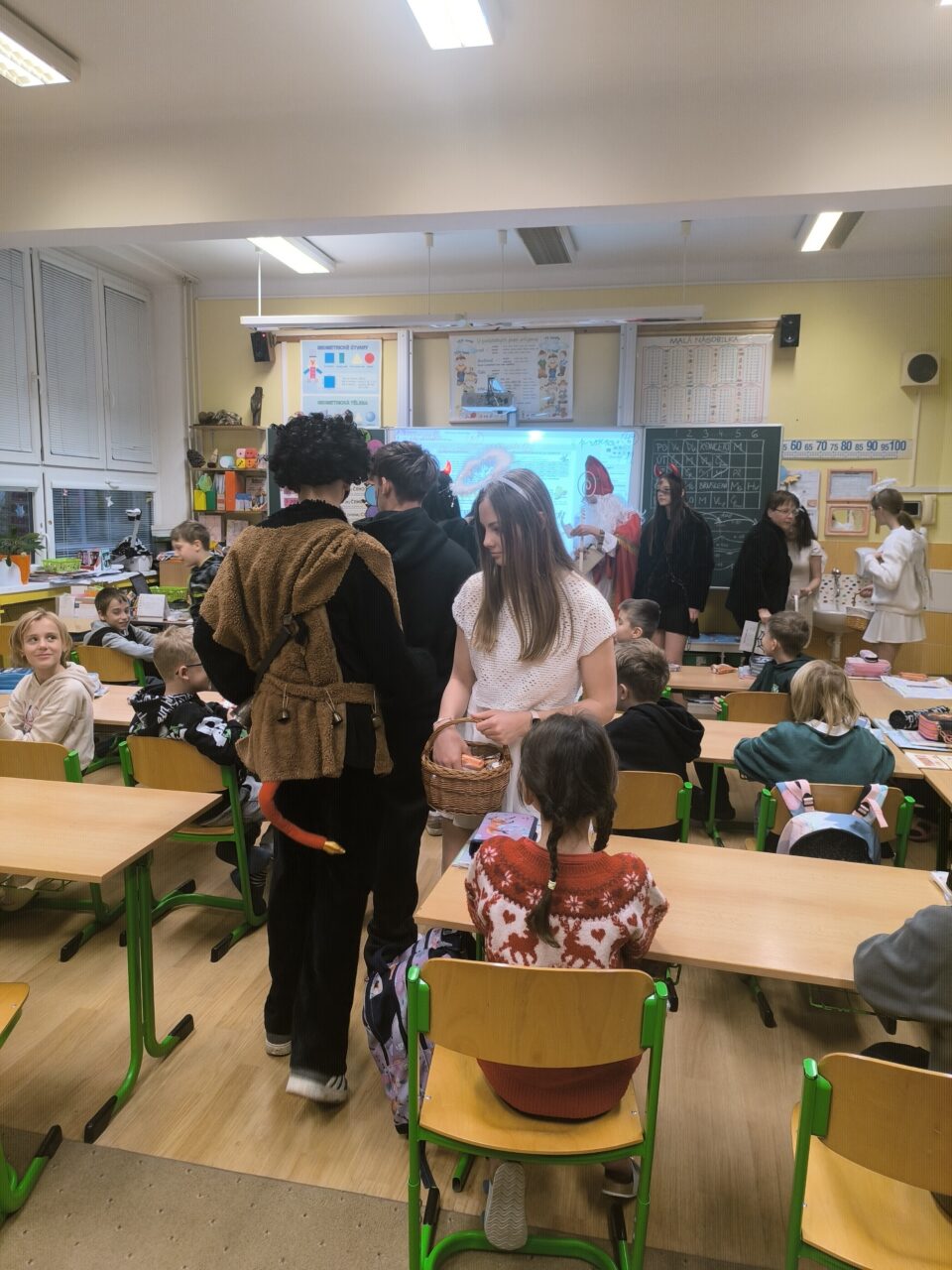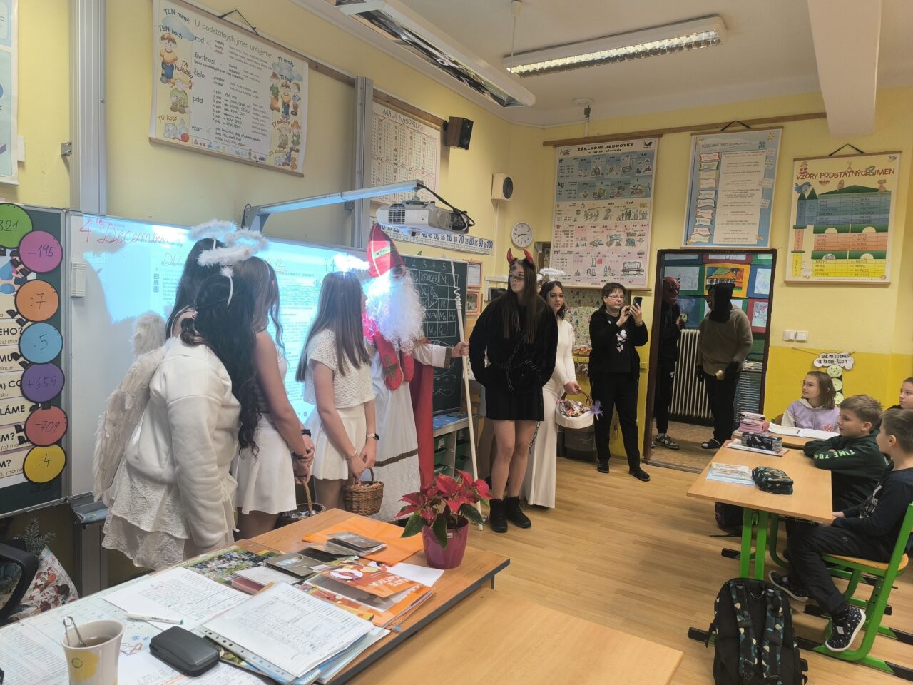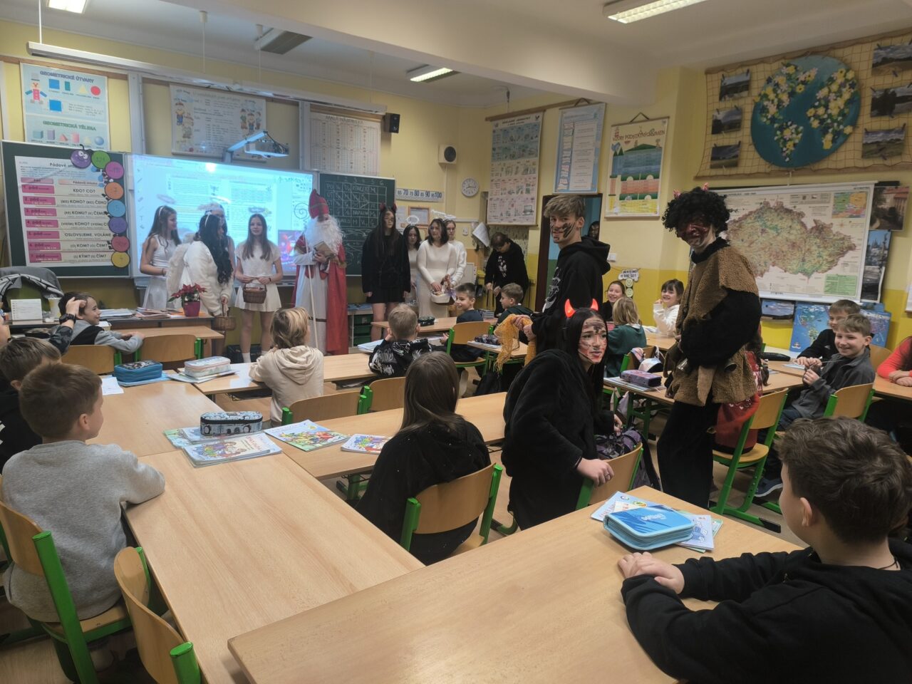 Jako každý rok v předvánočním čase se naší krajinou prochází Mikuláš se svou družinou čertů a andělů. Hodné děti obdarují andělé, ty které zlobily pokárá Mikuláš a větší hříšník se může dostat do spárů jeho čertíků, kteří si ho strčí do pytle a odnesou do pekla. Naštěstí, jejich letošní návštěva ve škole proběhla víceméně v klidu a žádného žáčka nám čerti do pekla nakonec neodnesli. Jak to vypadalo při jejich návštěvě u nás ve třídě se můžete podívat na fotografiích.