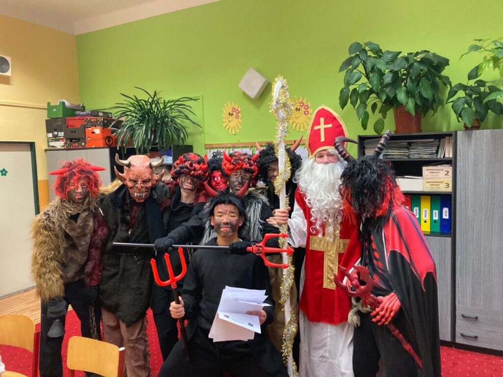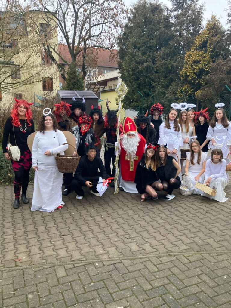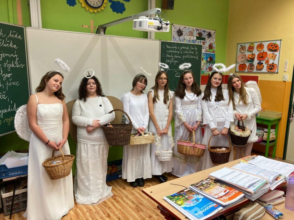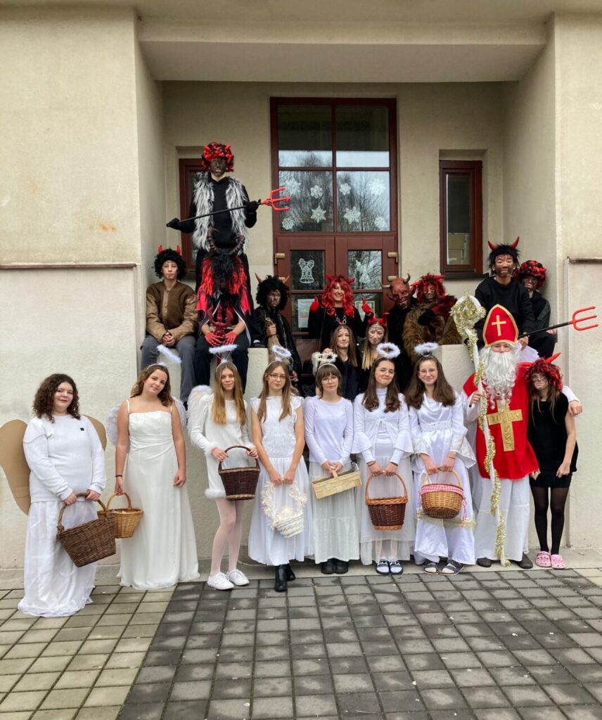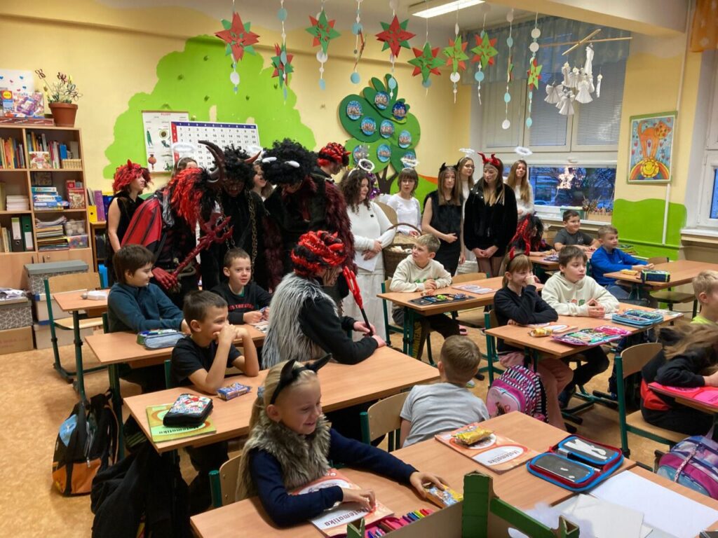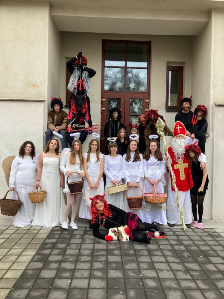 Je milou tradicí na naší škole, že nejstarší ročník si připraví čertovský program pro mladší spolužáky. Na chodbách i ve třídách potkáváte čerty, andílky a svaté Mikuláše. Andílci odměňují za dobré skutky a čerti naopak vyplácí za ty špatné. No a svatý muž si svoji družinu řídí a napovídá, protože o všech všechno ví a zná. Naše družina byla kouzelná a velmi početná. Byli jste super, moji deváťáci!