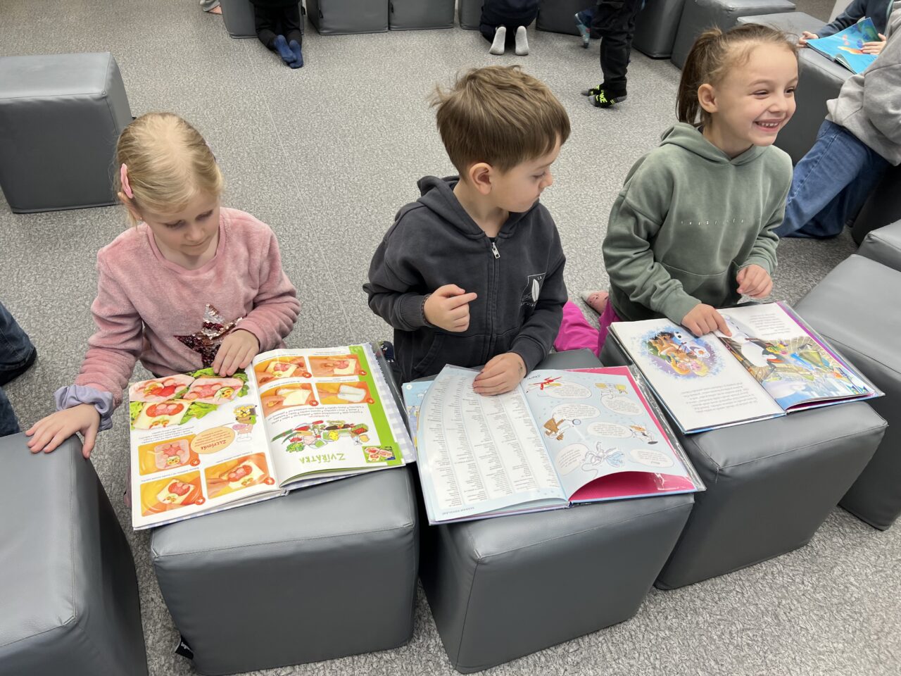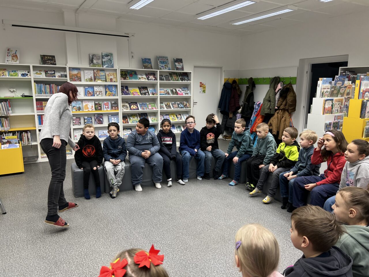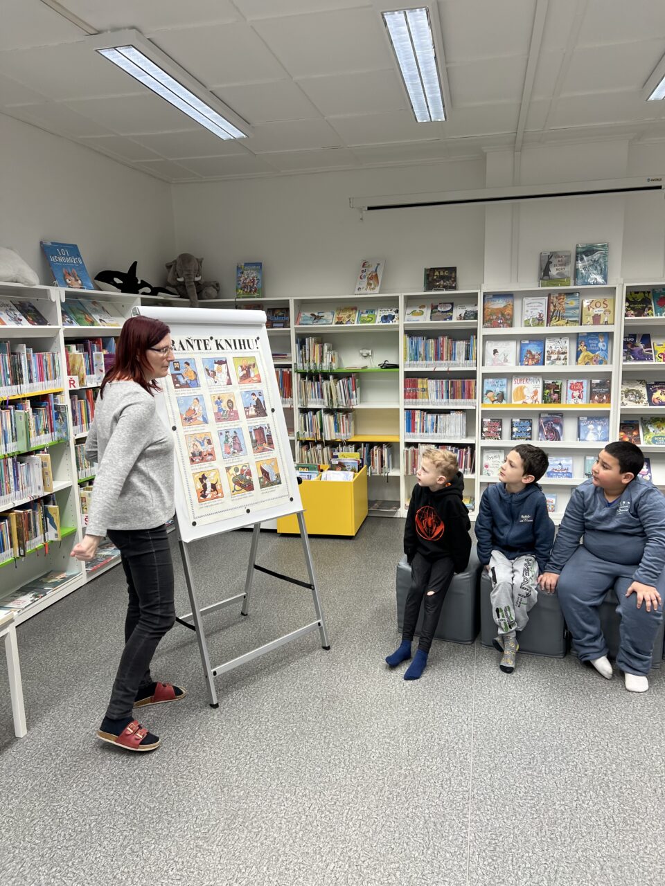 V pátek 23.1. jsme byli pozváni do knihovny. Přivítala nás milá paní knihovnice, která dětem vyprávěla o knihách. Děti se dozvěděly, jak s knihami zacházet, aby se nepoškodily, podle čeho jsou řazeny do polic, co všechno si v knihovně mohou půjčit. Nakonec si děti mohly knihy prohlédnout.